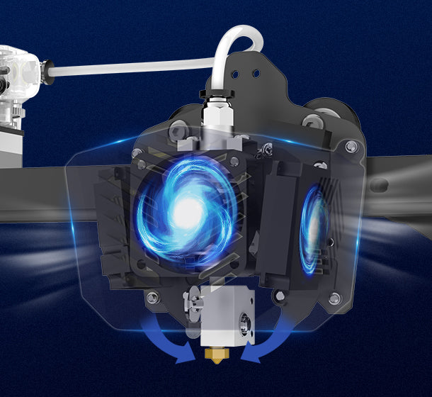 - The printing head adopts a double fan two-way heat dissipation system, cools down models rapidly. The printing speed is faster which can reach 100mm/s.