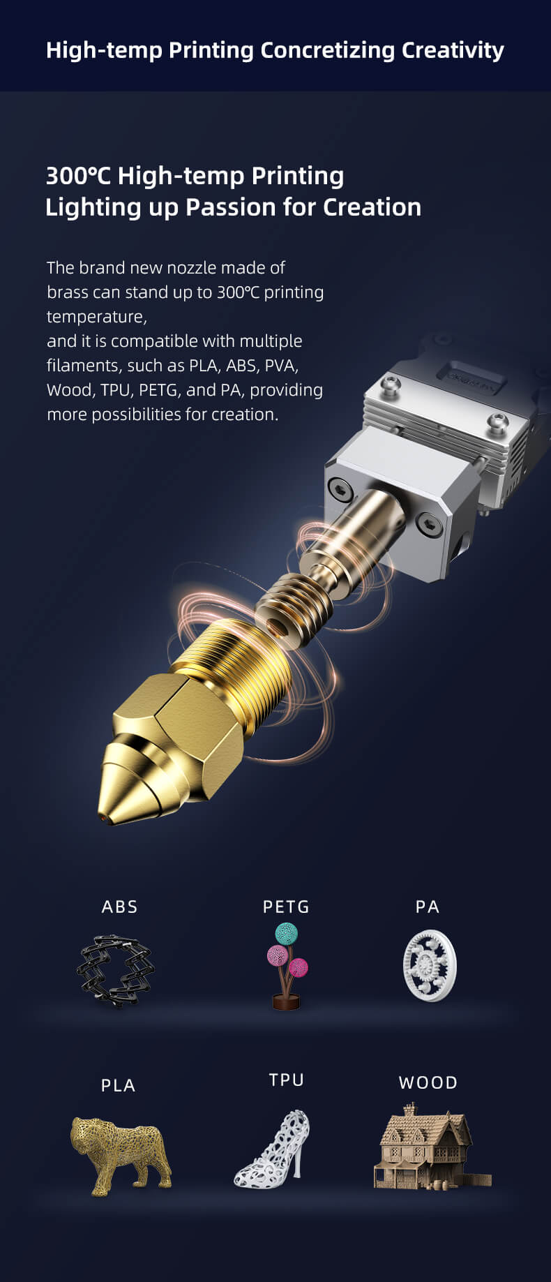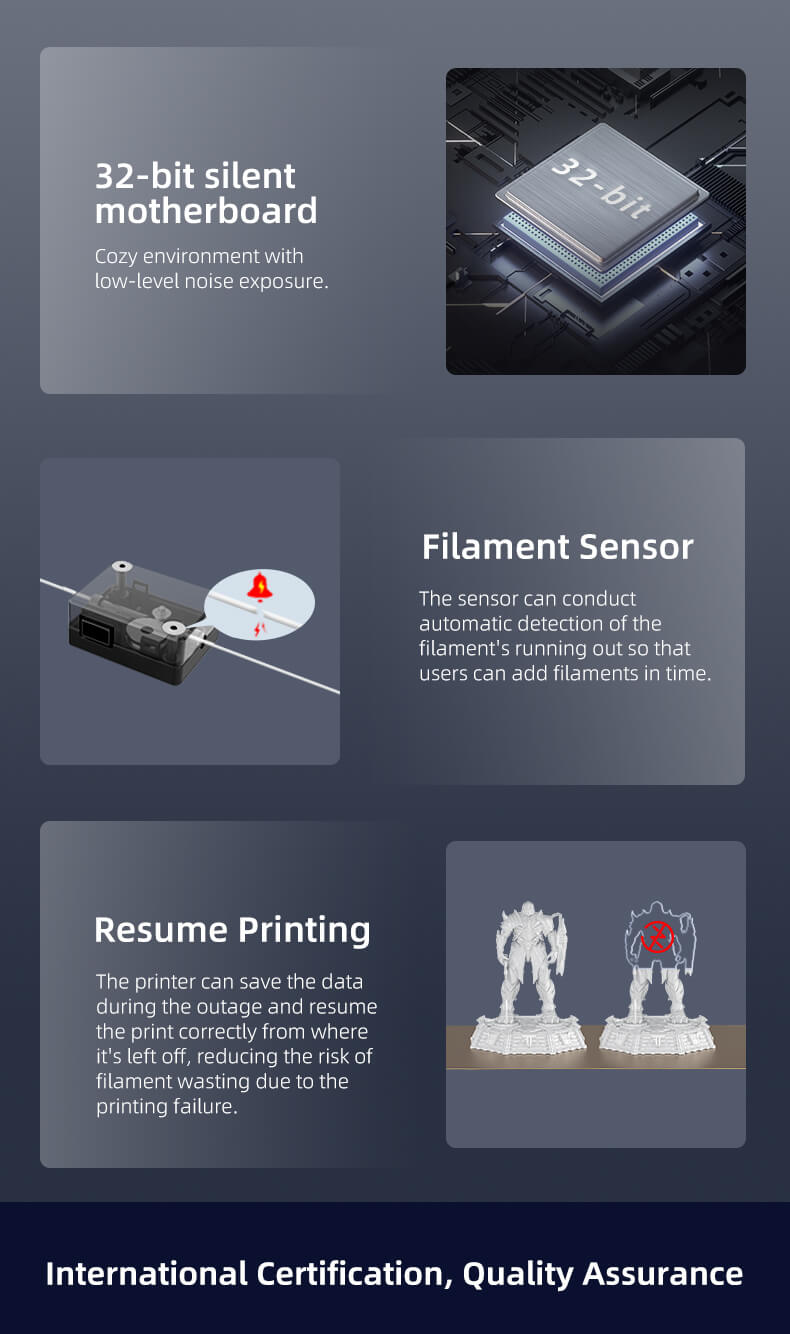 - Up to 300℃ high-temp printing support multiple filaments: It's compatible with multiple filaments, such as PLA, ABS, PVA, Wood, TPU, PETG, and PA, providing more possibilities for creation.32-bits silent mainboard print with coziness